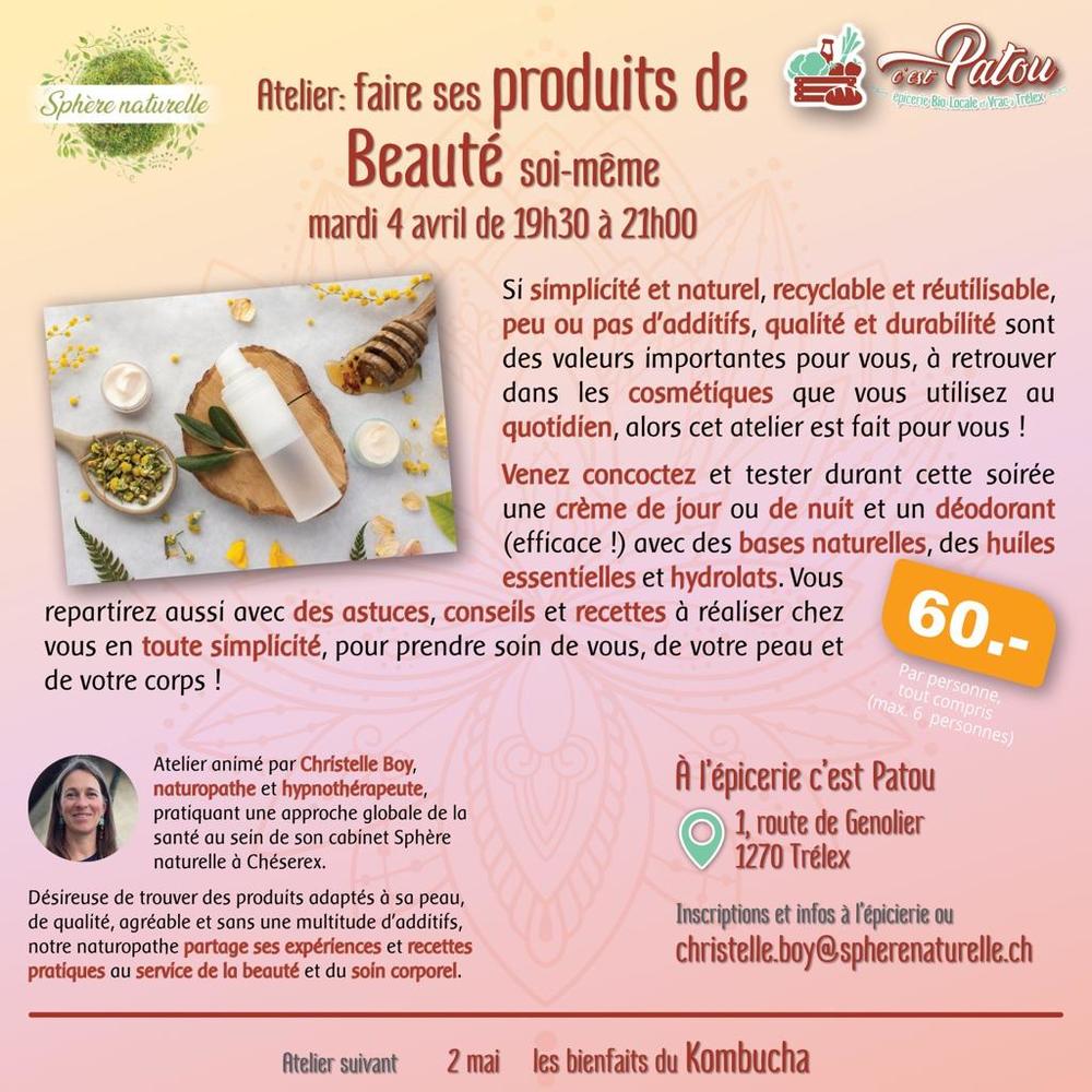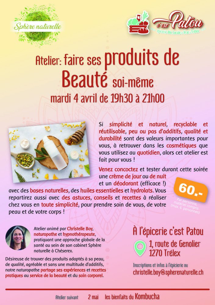 En avril, l'atelier donné par Christelle va nous chouchouter : venez apprendre à faire vos produits de beauté