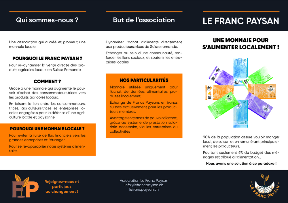 Le Franc Paysan est une monnaie locale gérée par l’association sans but lucratif du même nom, qui a comme objectif de promouvoir l’économie locale, la vente directe et les circuits courts dans le domaine de l’alimentation.
