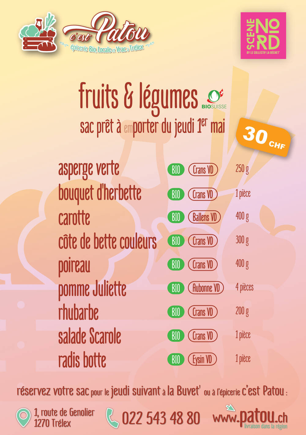Retrouvez-nous ce jeudi 1er mai dès 17h pour l'inauguration du marché de la Scène Nord à Nyon. Nous vous y proposerons des sacs prêts à emporter remplis de bons fruits & légumes BIO de nos producteurs locaux.