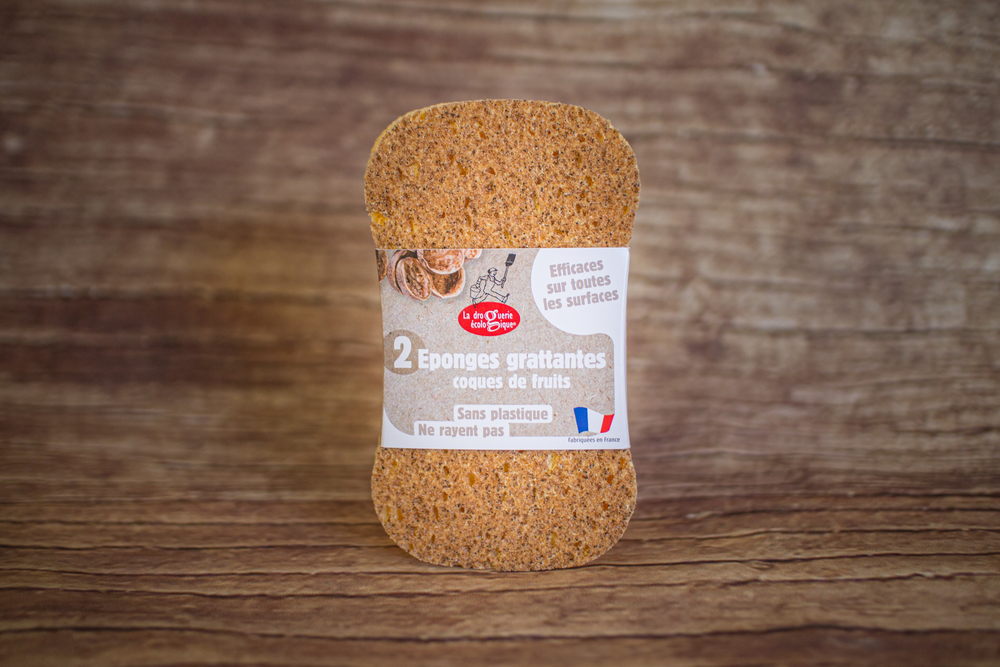 Fabriquée en France. Éponge à base de cellulose végétale et partie grattante conçue exclusivement à base de coques de noix, d’amandes et de pignons de pin.